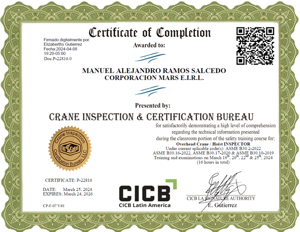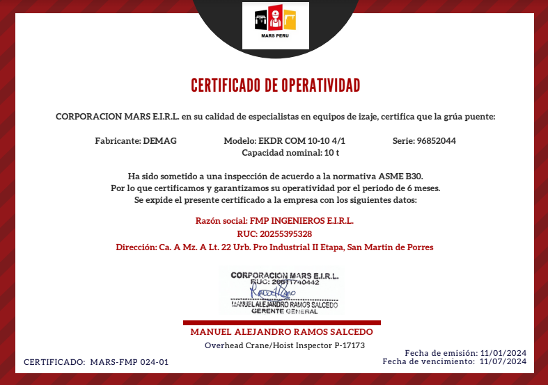 Además, inspeccionamos tus equipos, realizamos mantenimiento correctivo si es necesario, y entregamos el Certificado de operatividad a tecles, polipastos y puentes gruas conforme a normativa ASME B30, asegurando que cumplan con todos los estándares de seguridad y regulaciones vigentes.